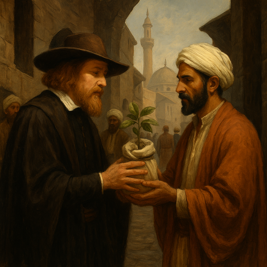 네덜란드 선원이 예멘 상인의 신뢰를 얻어 살아 있는 커피 묘목을 손에 넣는 데 성공한 것입니다.