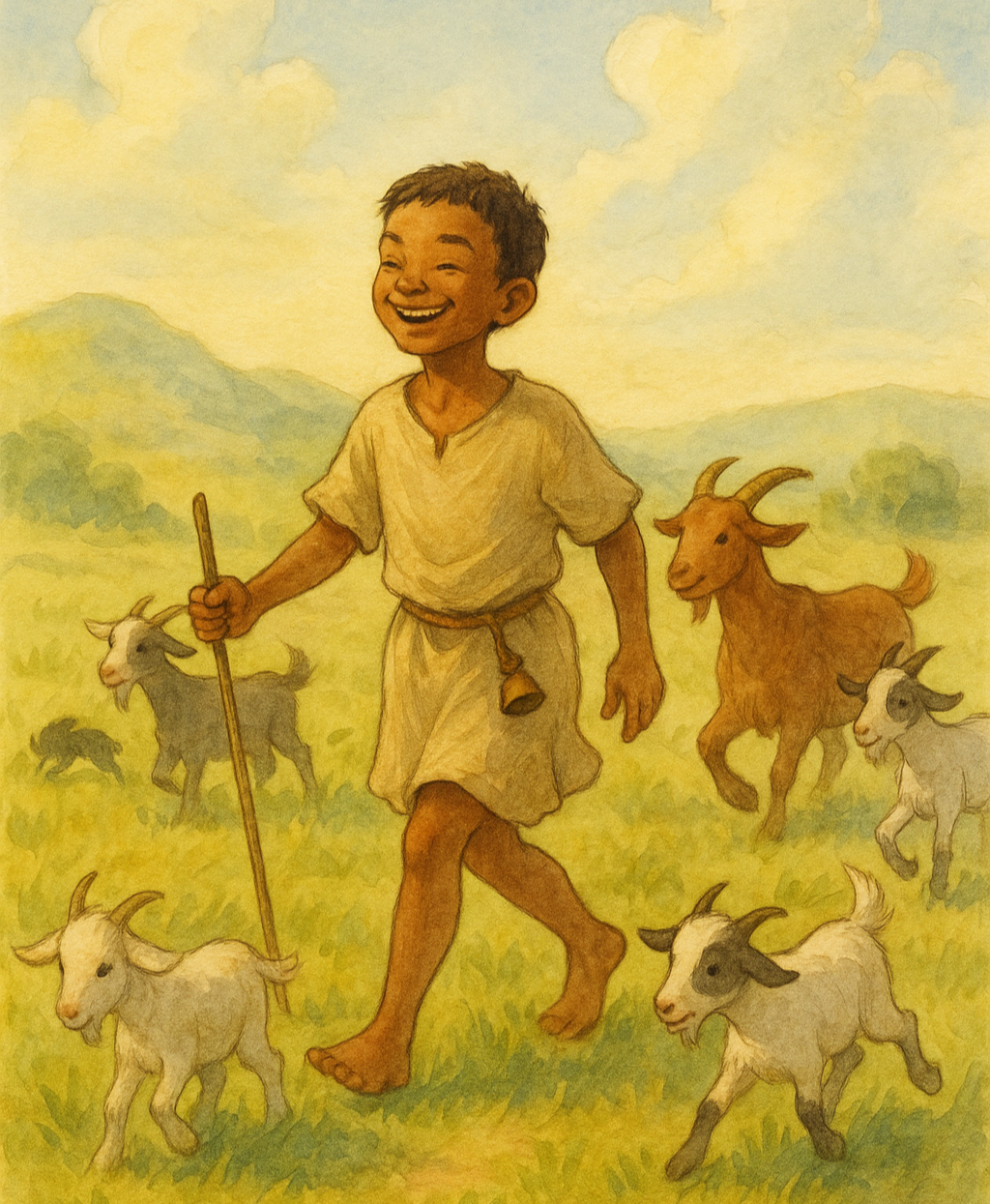"햇살이 부드럽게 스며드는 고원, 염소들이 활발하게 움직이는 모습, 그리고 그 가운데 서 있는 어린 목동."