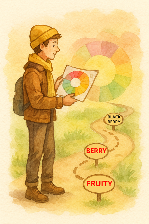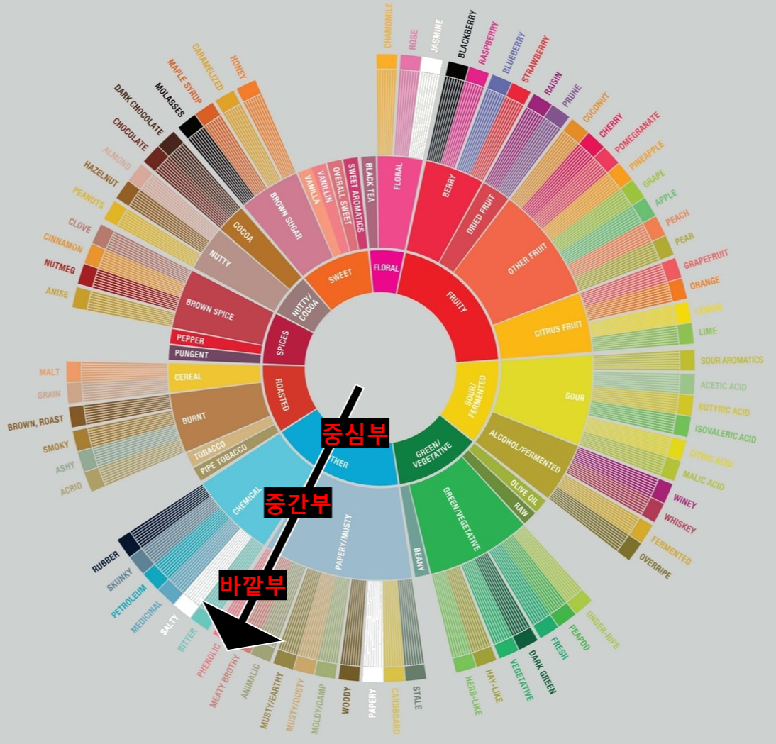 - 바깥부: 가장 구체적인 풍미 (예: 레몬, 블루베리, 건포도)