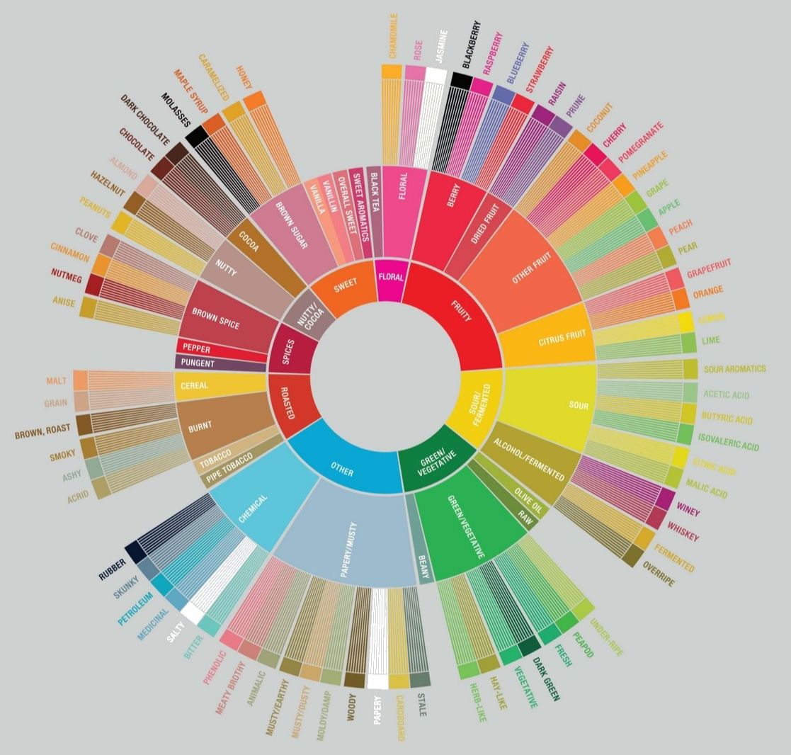 플레이버 휠은 단어뿐 아니라 색상으로 풍미를 연상하게 도와줍니다.