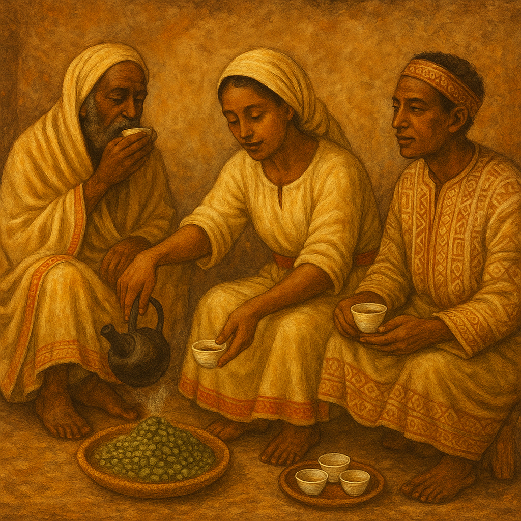 칼디와 염소의 전설이 커피의 발견을 상징적으로 보여준다면, 실제로 커피가 사람들의 삶 속에서 의미 있는 음료로 자리 잡은 것은 에티오피아의 전통적인 음용 방식과 의례 덕분이었습니다.
