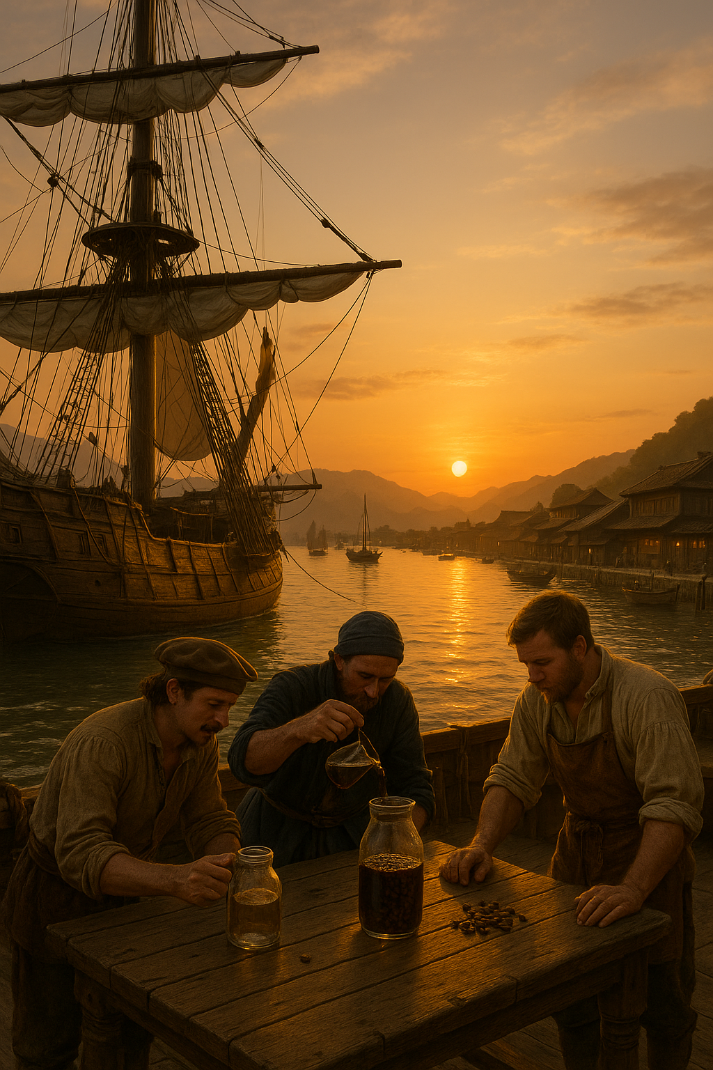 어느 날, 젊은 선원은 굵게 간 원두를 작은 자루에 담아 차가운 물에 담갔다. 불을 사용하지 않고, 바람과 시간에 맡겨 커피를 우려낸 것이다. 새벽이 밝아올 무렵, 자루 밑에는 진한 갈색 액체가 고여 있었다. 한 모금 마시자 놀라운 변화가 일어났다. 뜨겁지 않았지만, 각성 효과는 분명했고 맛은 오히려 부드러웠다. 이것이 바로 훗날 ‘콜드브루’, 혹은 **‘더치커피’**라 불리게 될 방식의 시작이었다.