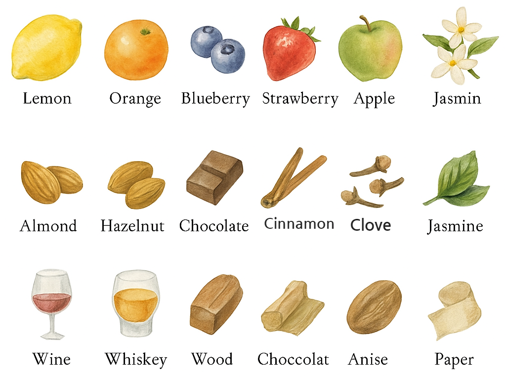 - 바깥: 구체적인 풍미 (예: 레몬, 오렌지, 블루베리, 자스민 등)